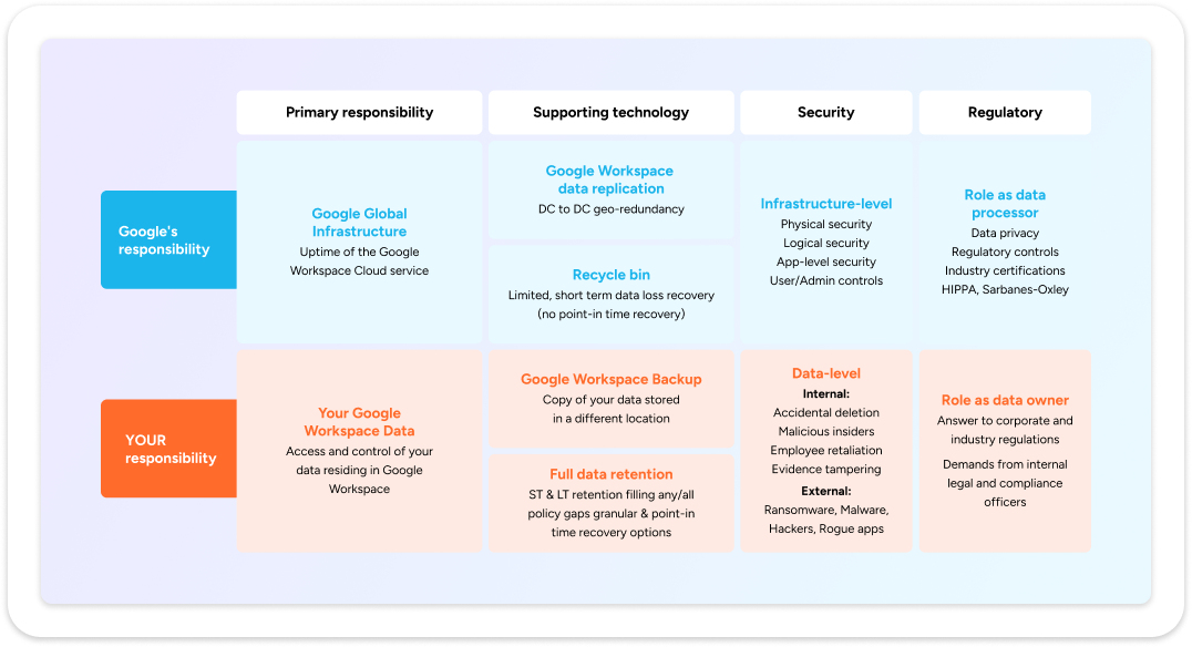 In de praktijk hanteert Google Workspace een shared responsibility model: Google zorgt voor de beveiliging en het beheer van de cloud service, terwijl jouw organisatie zelf verantwoordelijk is voor de bescherming van de data en ervoor moet zorgen dat deze indien nodig hersteld kan worden.